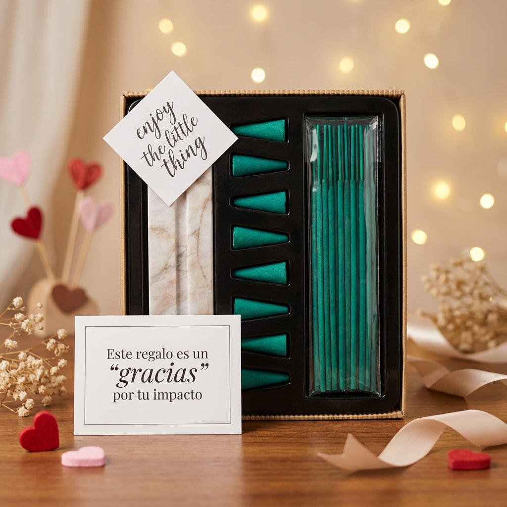 La caja también contiene un portaincienso de mármol, diseñado con un acabado sofisticado para un uso práctico y decorativo. Perfecto para regalar o complementar espacios de oficina, meditación, o tu hogar.