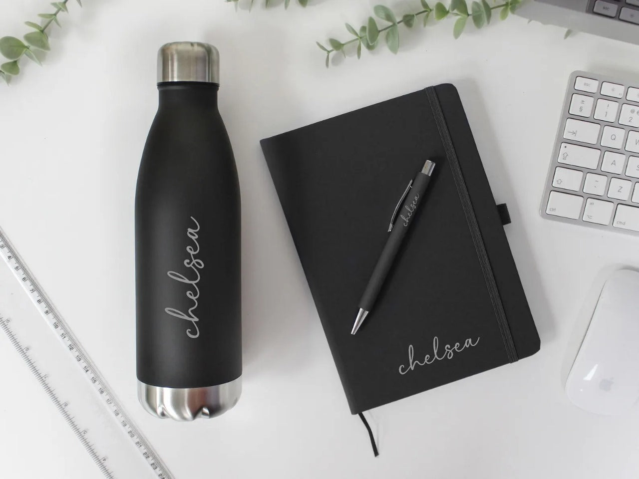Todos los elementos están personalizados con el nombre o logo que elijas, aportando un toque único y profesional a cada detalle.