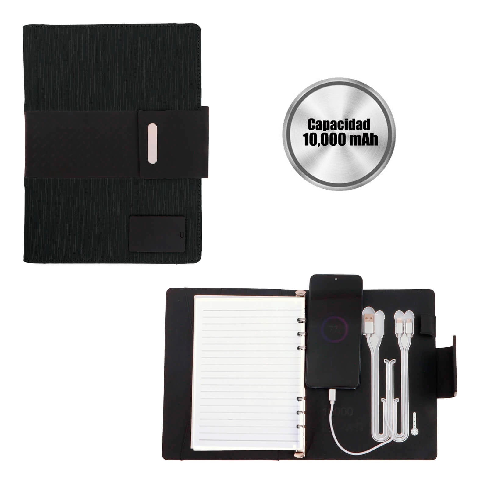 Potencia, estilo y funcionalidad en un solo regalo corporativo. Esta carpeta ejecutiva de poliéster combina diseño profesional con tecnología de alto rendimiento. Cuenta con un elegante cierre magnético, un block de 100 hojas rayadas y espacio para tarjetas. Además, incluye una power bank de 10,000 mAh integrada con cables USB, tipo C, micro USB y Lightning, perfecta para mantener tus dispositivos cargados durante el día.