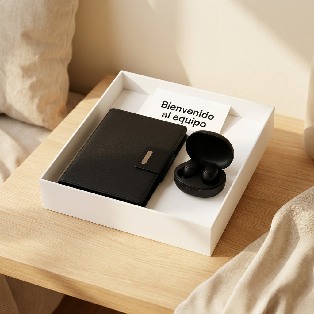 Incluye audífonos inalámbricos y se entrega en una caja de presentación de lujo con tarjeta “Bienvenido al equipo” o se puede personalizar